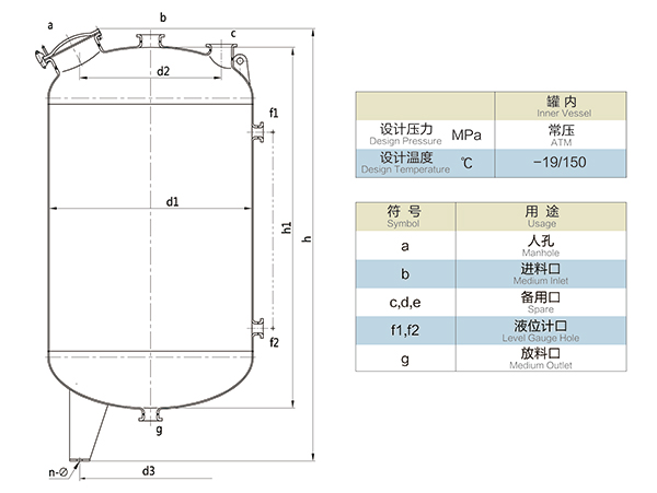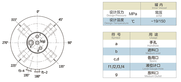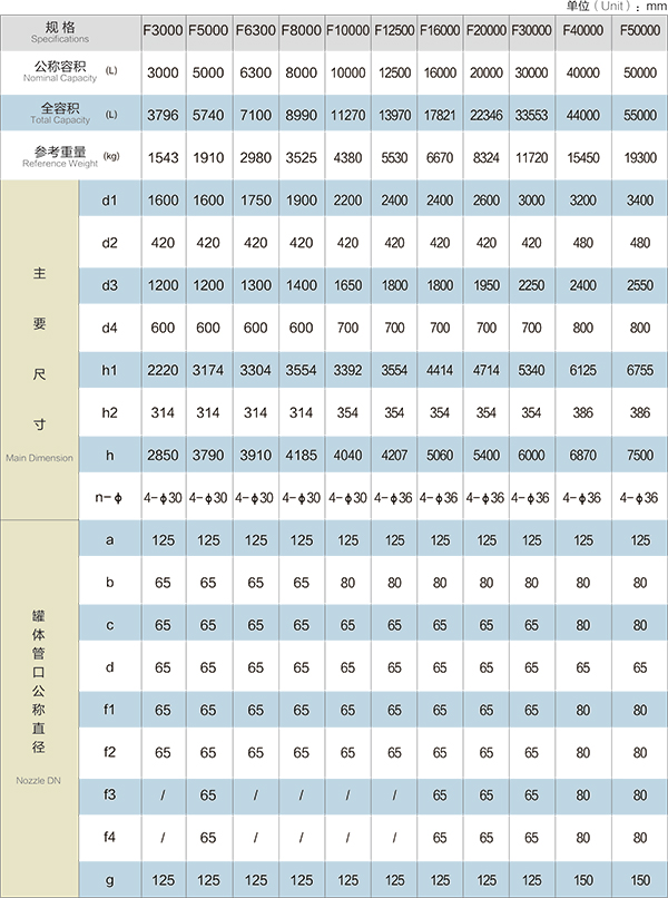 F3000L-F50000L閉式搪玻璃貯罐(閉式搪玻璃儲罐)設計圖紙及參數如下所示: