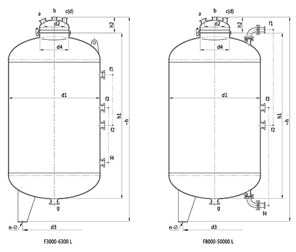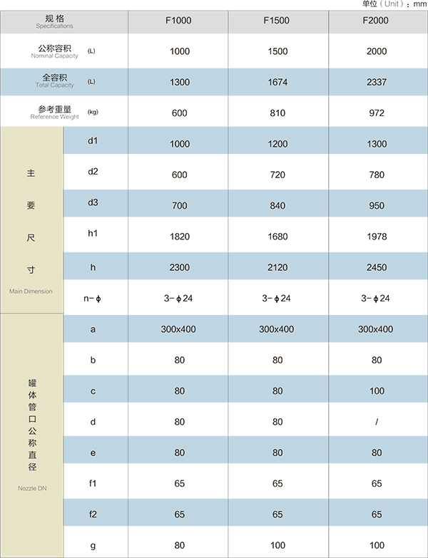 F1000L\F1500L\F2000L閉式搪玻璃貯罐(閉式搪玻璃儲罐)設計圖紙及參數如下所示: