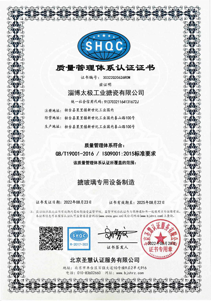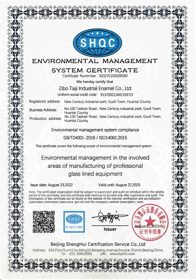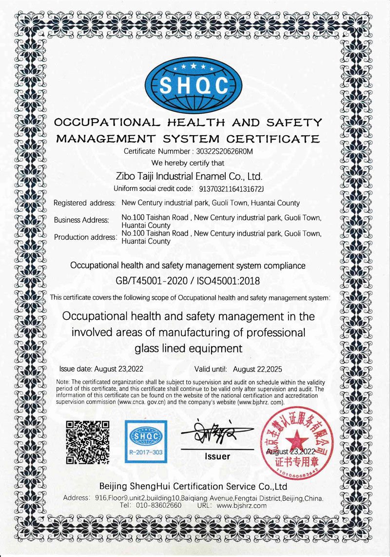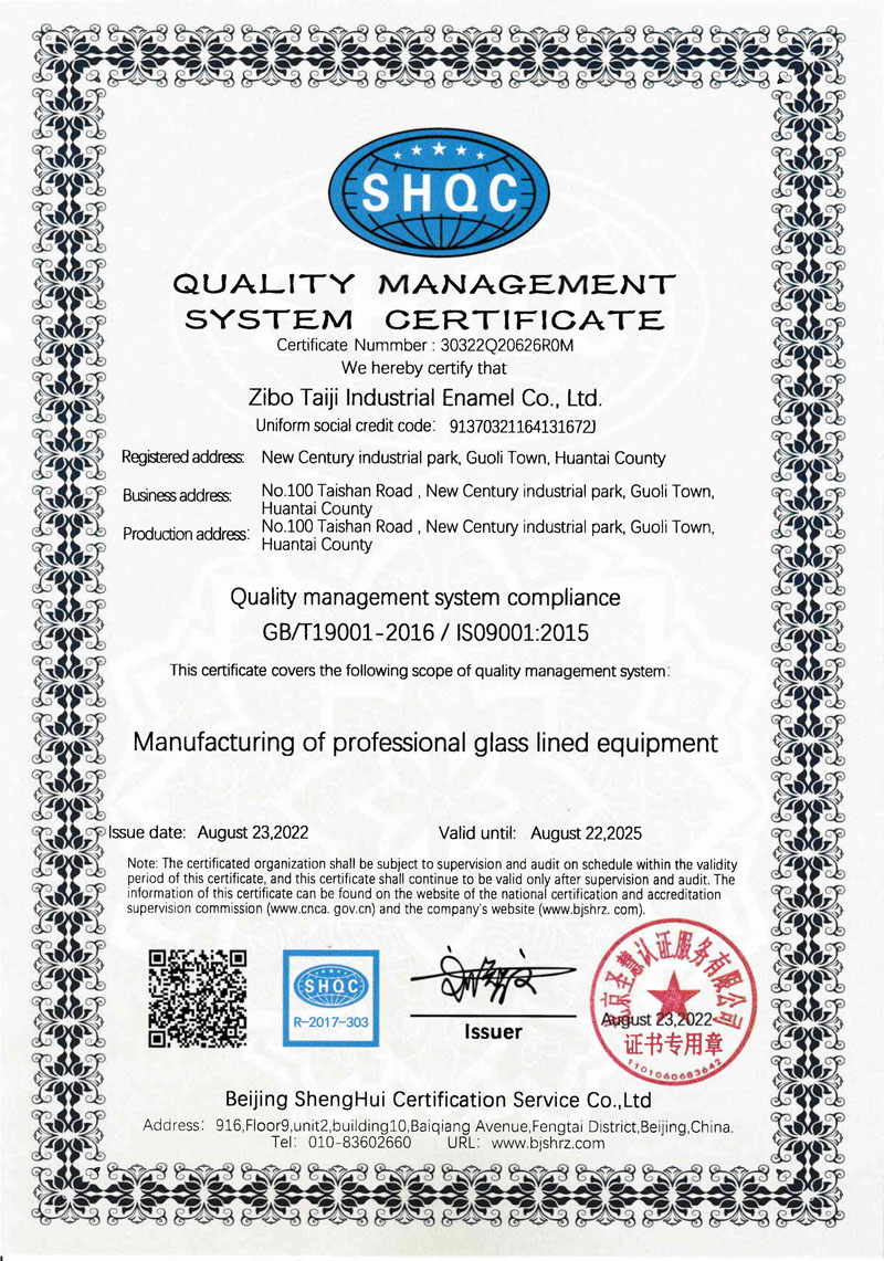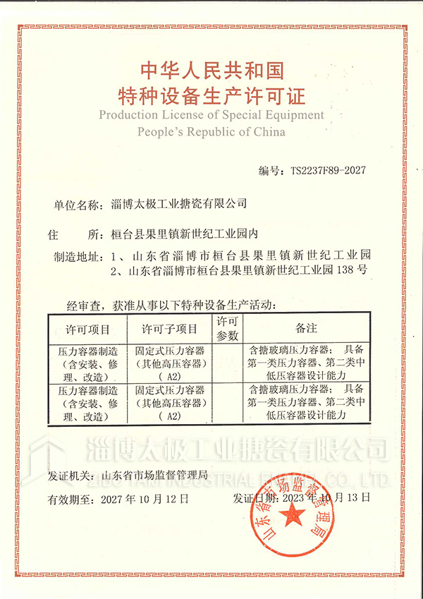 淄博太極在中國搪玻璃設(shè)備制造行業(yè)中首家通過ISO90001質(zhì)量體系認證,并擁有美國ASME認證、歐洲PED認證以及國家部門頒發(fā)的搪玻璃制造許可證、進出口許可證和百余項榮譽證以及三十六項專利等。