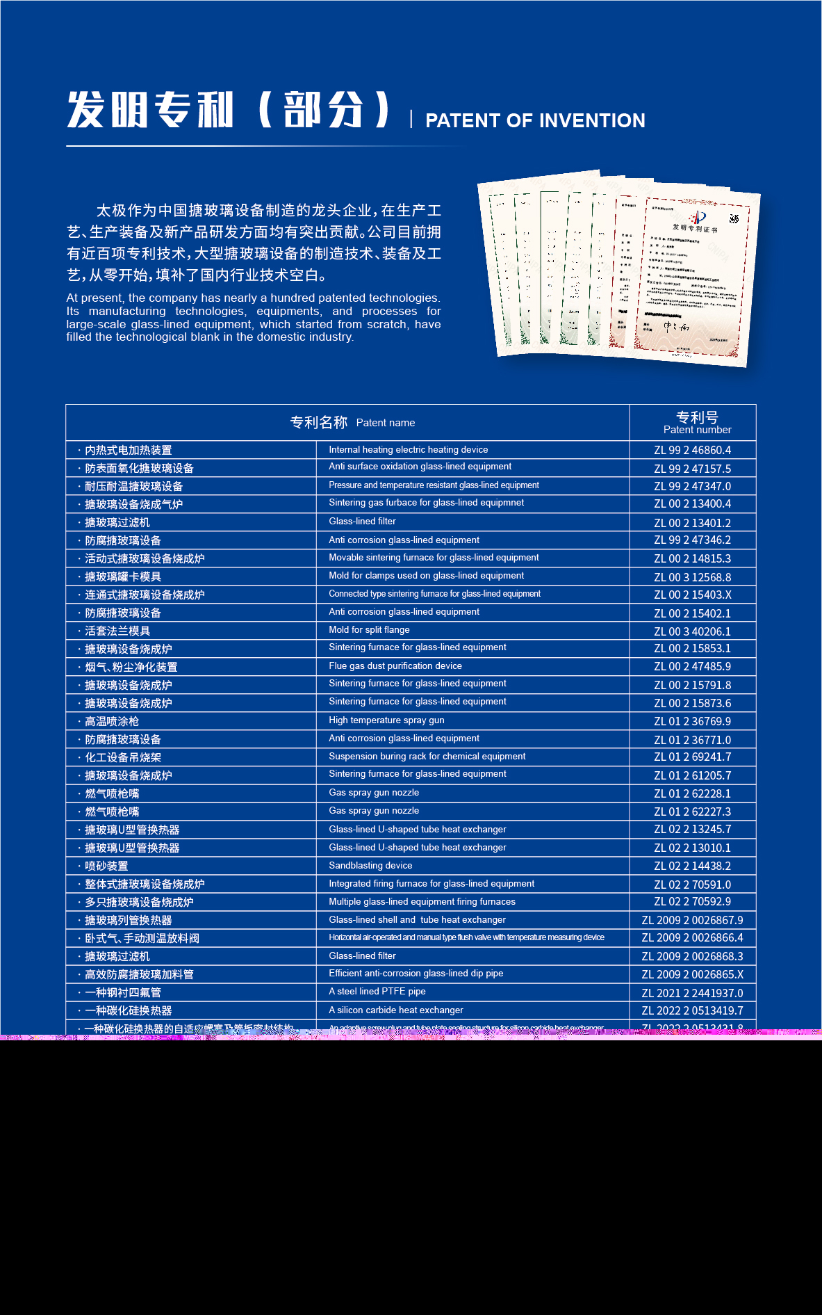 淄博太極在中國搪玻璃設備制造行業中首家通過ISO90001質量體系認證,并擁有美國ASME認證、歐洲PED認證以及國家部門頒發的搪玻璃制造許可證、進出口許可證和百余項榮譽證以及三十六項專利等。